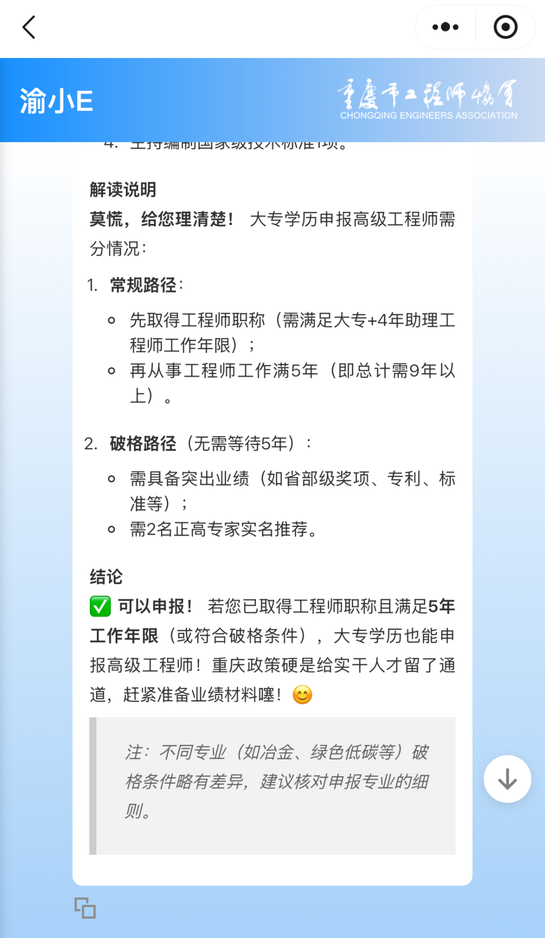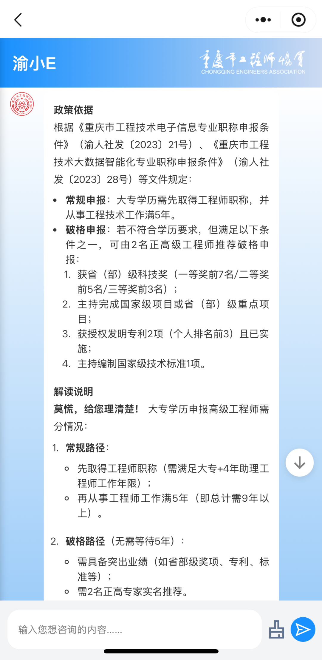 有工程技术领域职称申报问题均可以直接向渝小E提问!
