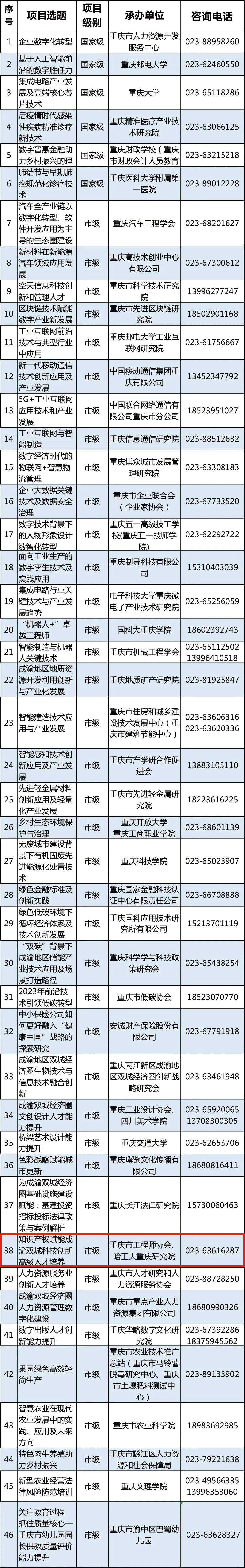我会申报的高级研修项目《知识产权赋能成渝双城科技创新高级人才培养》(列表第38项)名列其中。该项目课题预计将在2023年10月份召开,请大家敬请关注,欢迎积极报名参加。